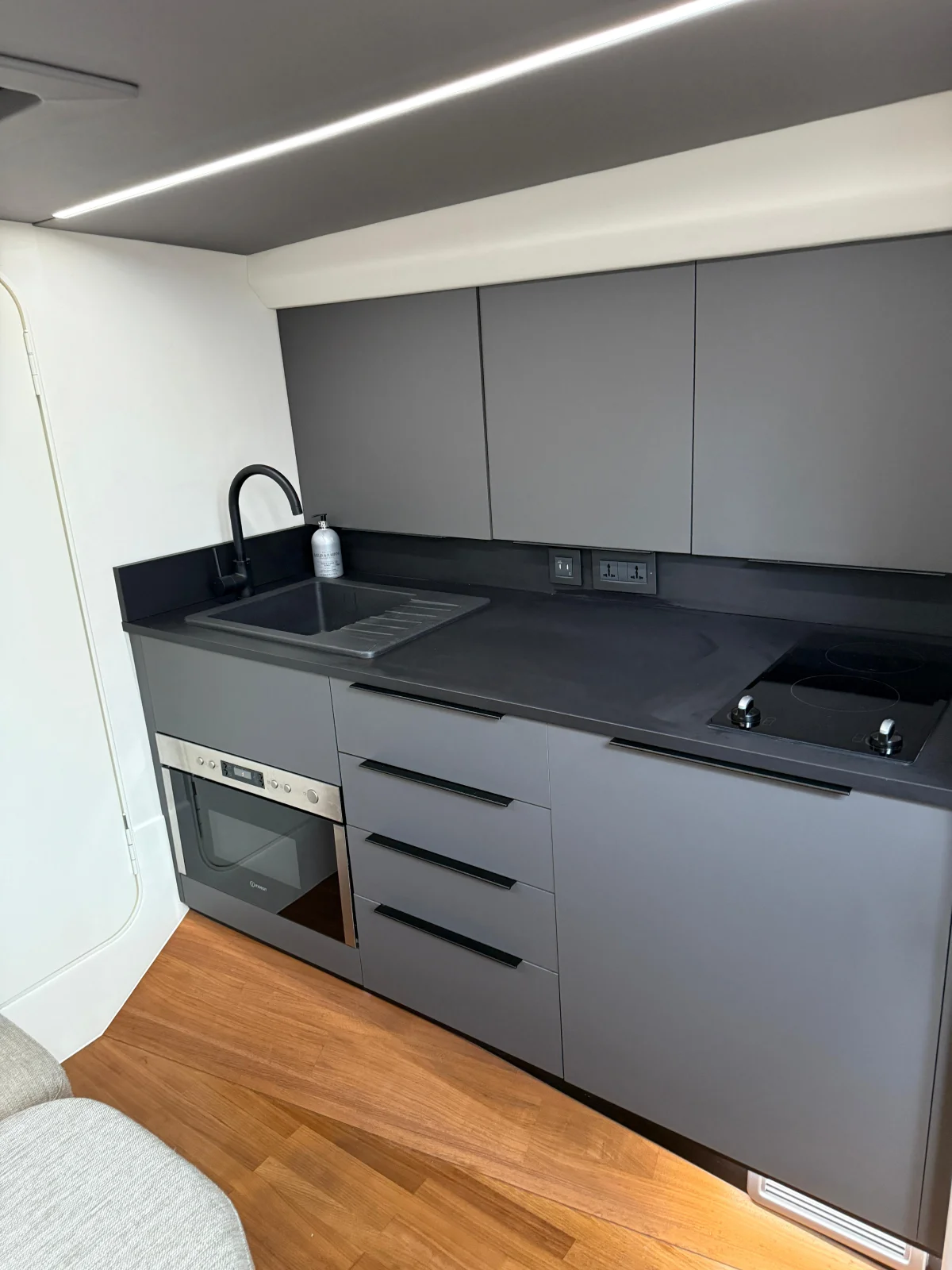 Cocina reacondicionada con muebles y encimeras en gris/negro ultra modernas incluyendo microondas/horno combinado, placa de cerámica y fregadero/escurridor. Nevera de cambio automático de 12/230 voltios.