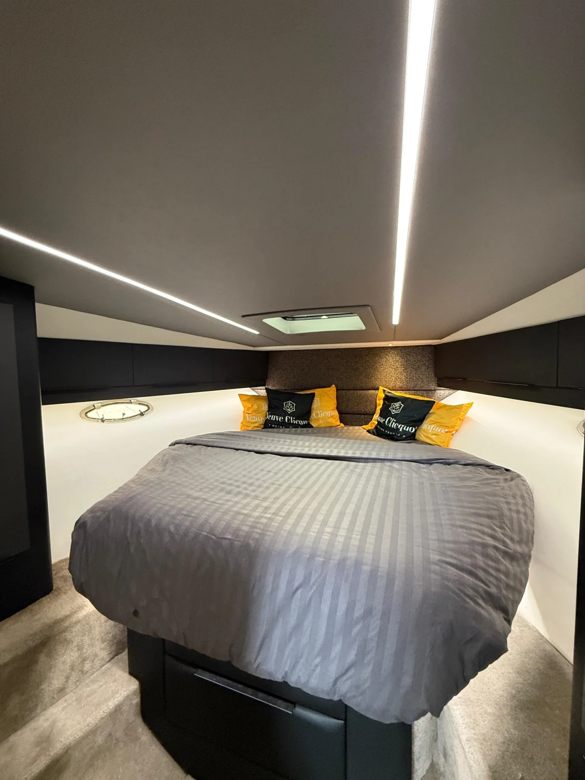 Tapicería exterior completamente reacondicionada en Silvertex naranja quemado con costuras destacadas que contrastan maravillosamente con el interior gris con alta iluminación y cubierta de Flexiteak sintética que se extiende hasta la plataforma de baño ampliada.