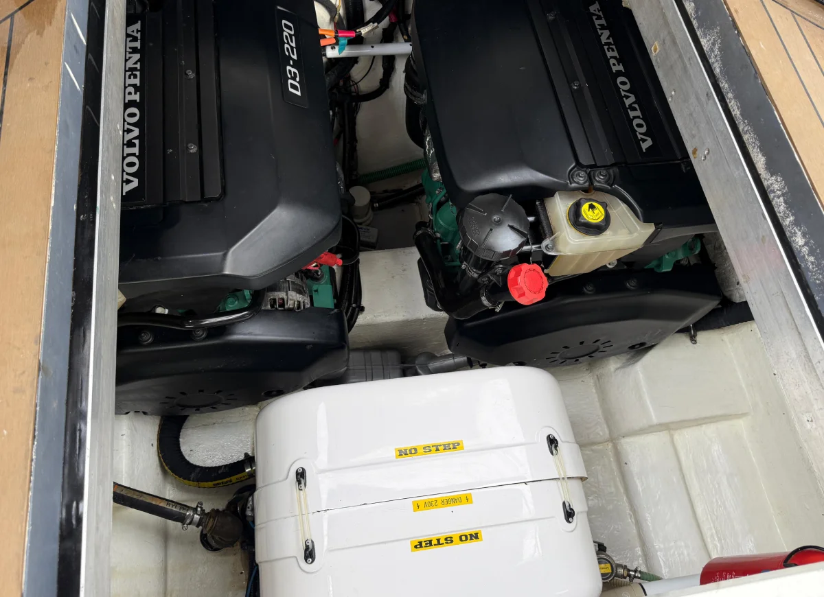 Dos nuevos motores Volvo Penta D3 220 y transmisiones Volvo D/P instaladas en abril de 2021, justo después de haber tenido su primer servicio oficial que extiende la garantía de Volvo hasta abril de 2023.